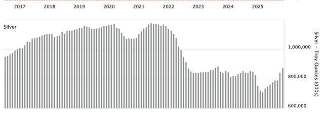 LBMA数据显示,截至11月底,白银库存为8.74亿盎司,较上半年的低点7.11亿盎司有所增加,但整体仍处于近年来的低位。